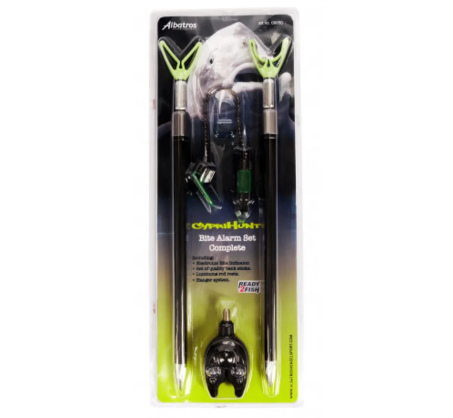 Set bestaat uit 2 telescopische banksticks die voorzien zijn van hengelsteunkopjes, elektronische beetmelder en een dropbite indicator.