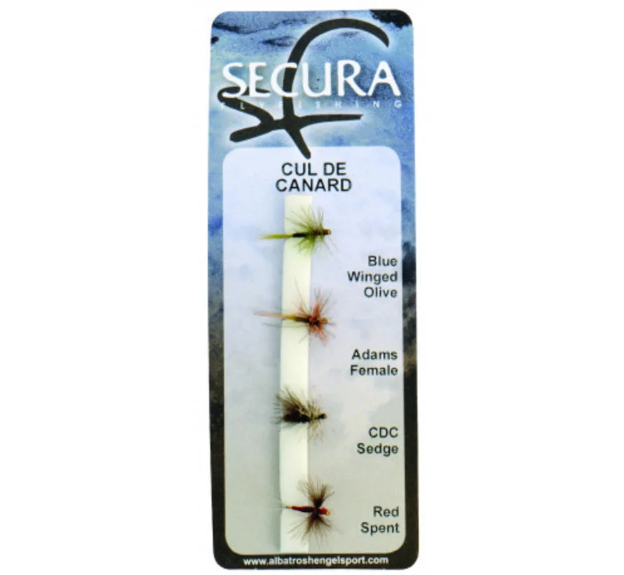 Vier droge eendekontvliegen: Olive Ephemera, Fastwater Grey, Standard en Orange Elkwing Emerger. Eendekontvliegen staan bekend om hun drijfvermogen, goede werpeigenschappen en hoge vangkracht.