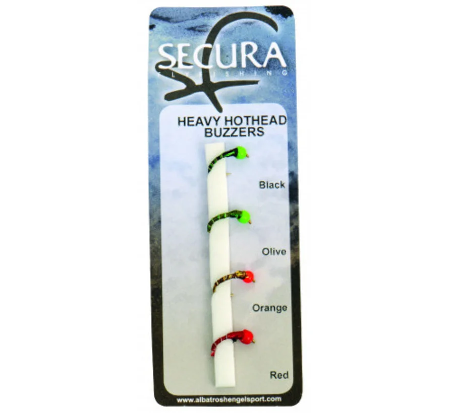 Set van vier fluo buzzers: Black Buzzer Orange Bead, Olive Buzzer Green Bead, Brown Buzzer Orange Bead en Red Buzzer Red Bead