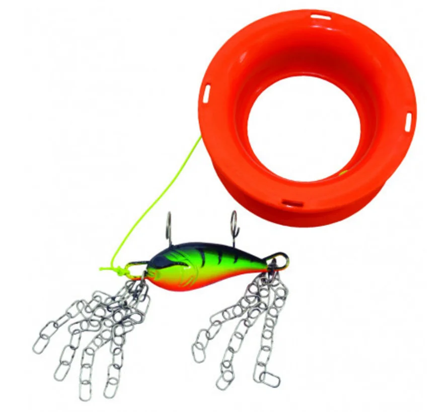 Laat de kunstaasredder afglijden langs een gespannen lijn. De kunstaasredder hecht zich aan de haken van het kunstaas. Kunstaas wordt middels de aan het kunstaasredder bevestigde touw losgetrokken. Compleet met lijnrol.