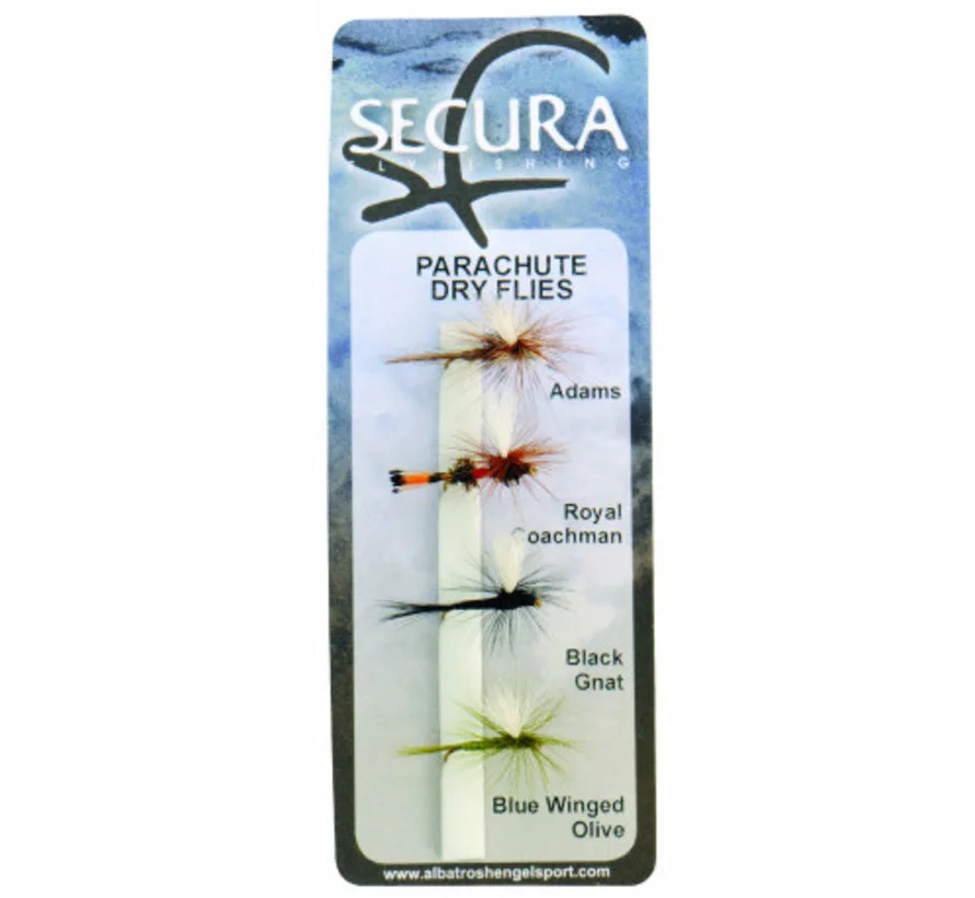 Vier parachute vliegen: Adams, Blue Wing Olive, Hi-Viz Royal Coachman en Black Gnat.