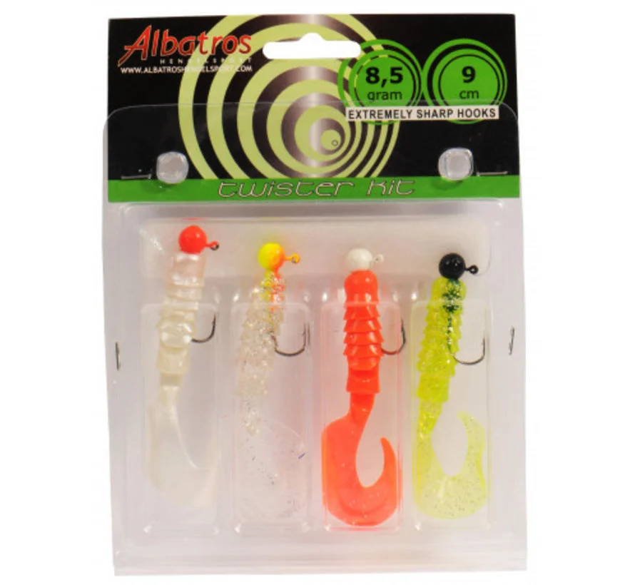 Set bestaande uit 4 verschillende kleuren twisters van 9 cm met 4 jigkopjes van 5 gram.