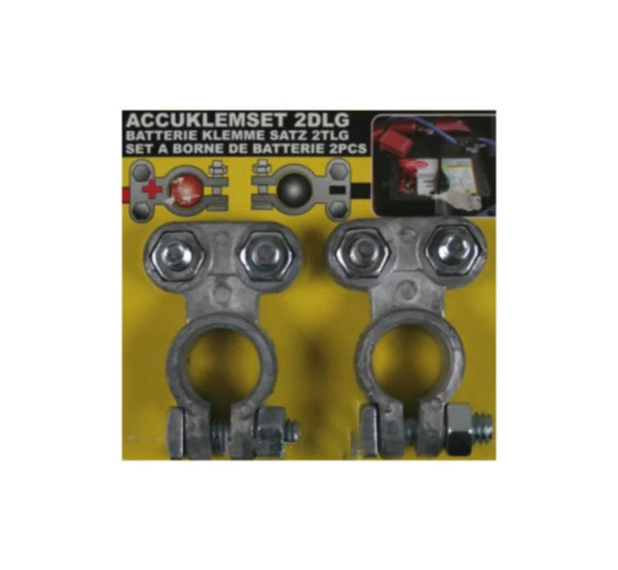 Accuklem set van 2 stuks voor uw accu. Afmetingen Lengte 55mm x Breedte 37mm x Hoogte 20 mm. U kunt de moer aan de zijkant vast draaien zodat hij nagenoeg op elke accu past. Verpakt per set.