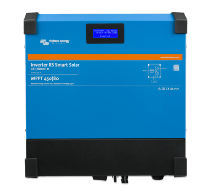 De Victron Inverter RS Smart Solar is een combinatie van een krachtige 48VDC, 6kVA 230VAC inverter en een hoog voltage, 80-450VDC, 4kW MPPT zonne-energielader. Dankzij diens modern ontwerp en hoge frequentie-technologie weegt de inverter maar 11 kg. en heeft het een uitstekende efficiëntie, laag noodvermogen en zeer stille werking.
